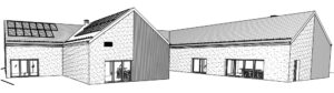 Construction of foundations, walls, roof trusses, internal and external installations, as well as complete interior finishing and furnishing.
